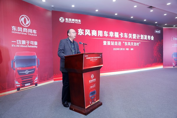12月1日,东风商用车幸福卡车关爱计划发布会暨首站走进“东风天龙村”活动在河南偃师圆满举行,来自偃师当地的卡友代表以及多家区域、行业媒体共同见证东风商用车幸福卡车关爱计划的发布。
